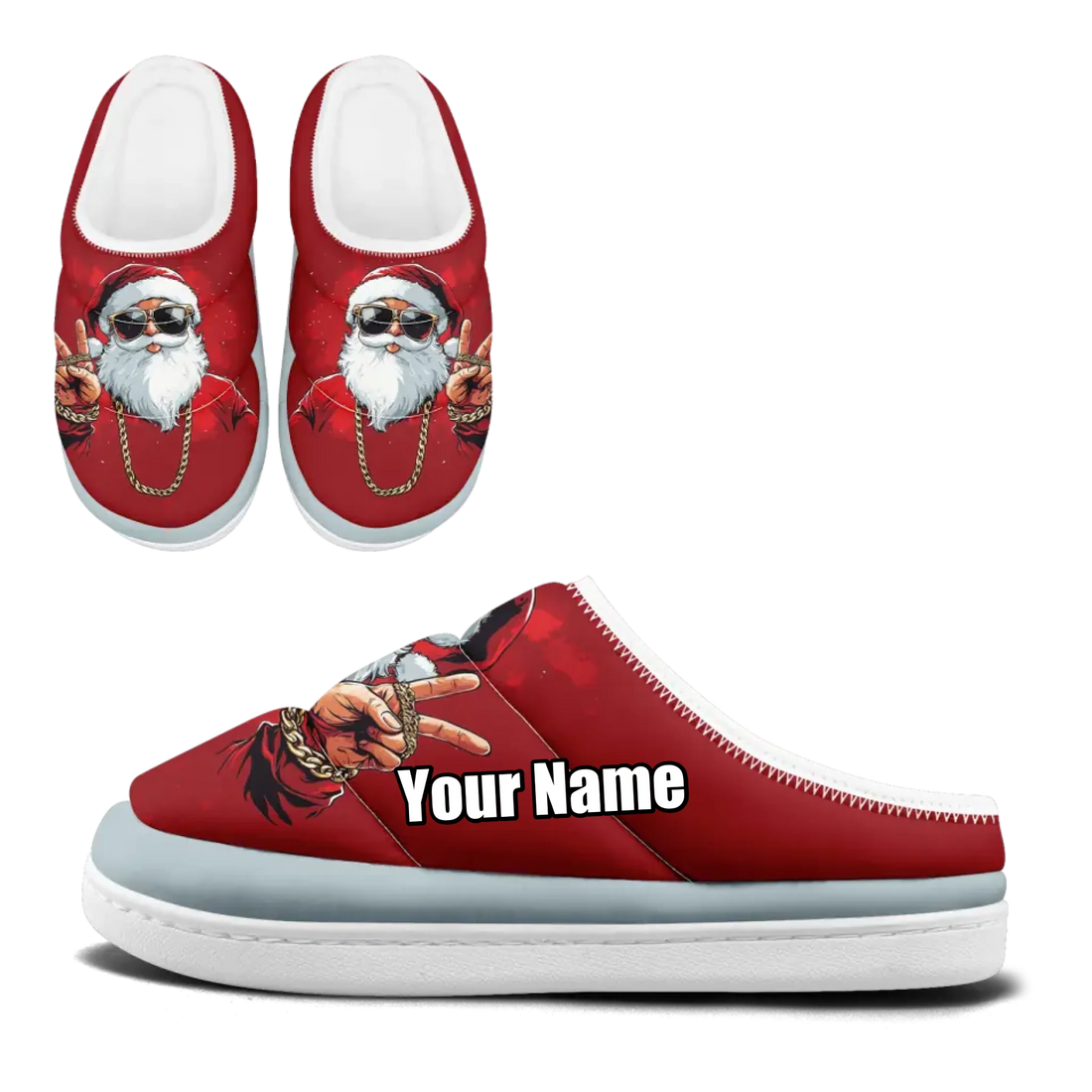 Cool Hip Hop Santa Christmas Plush Slippers, Funny Festive Peace Sign Cozy House Shoes FN057-25027148