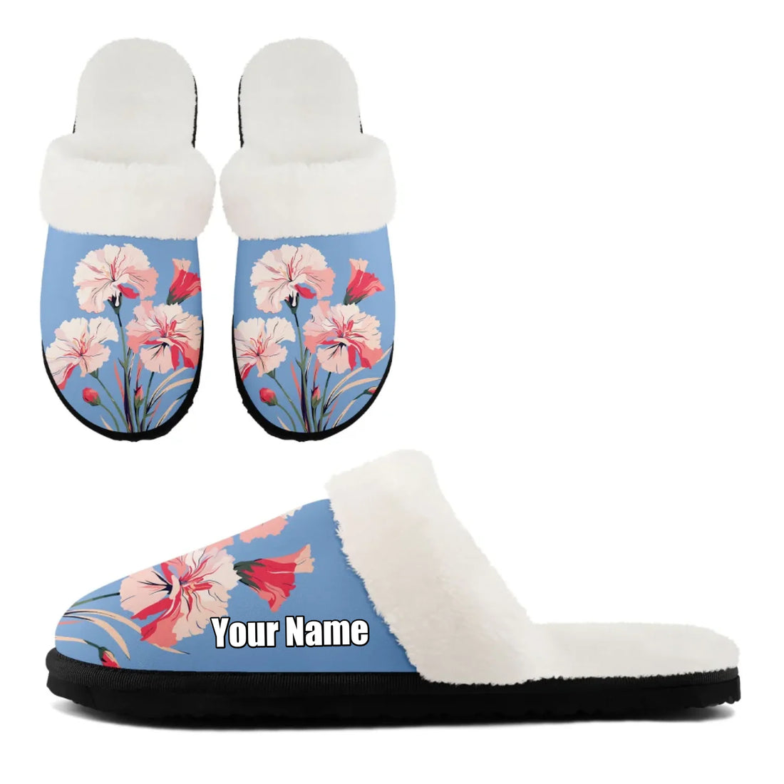 Elegant Carnation Floral Plush Lined Slippers, Cozy Botanical Art Print House Shoes FN089-25028154