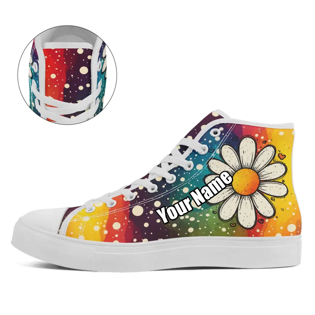 Groovy Rainbow Daisy High-Top Sneakers, 70s Hippie Flower Power Festival Canvas Shoes FN024-25009065
