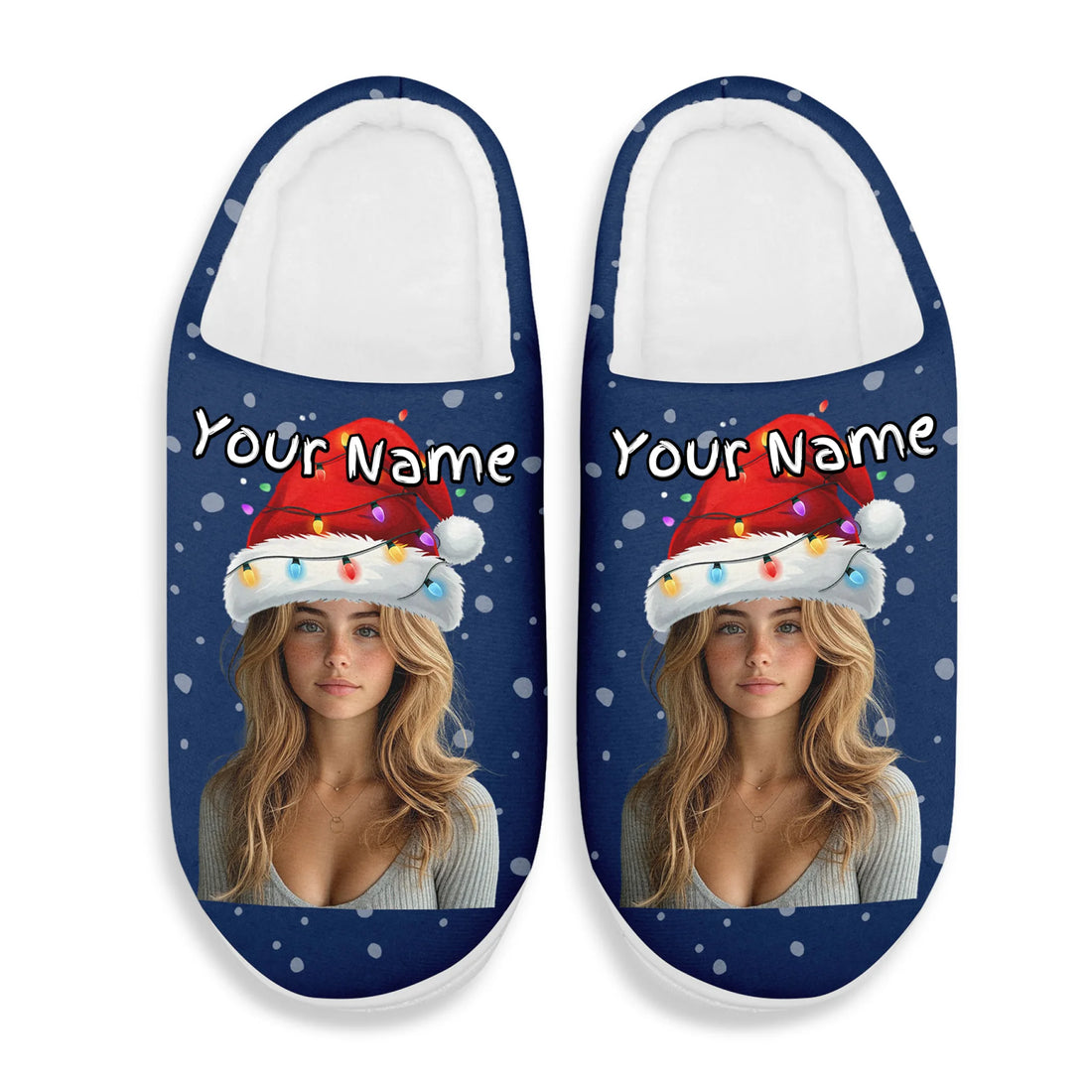 Custom Photo Christmas Slippers with Neon Light Santa Hat - Personalized Cozy House Shoes, Unique Festive Holiday Gift FN060-25028125