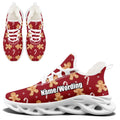 These cheerful athletic shoes feature an adorable pattern of gingerbread men and candy canes on a festive red background.