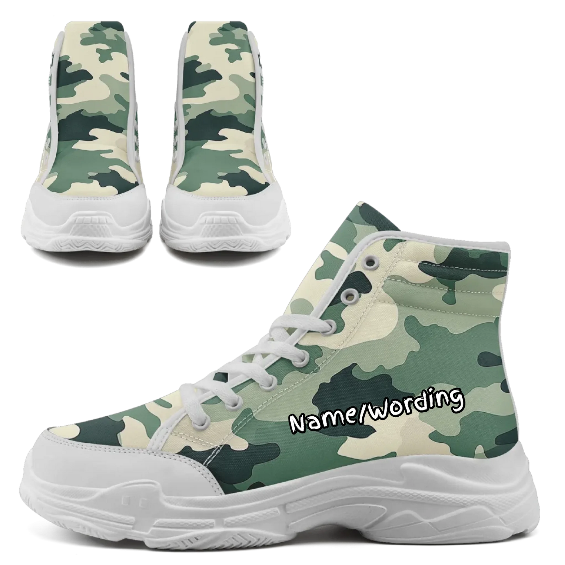 Step up your streetwear game with our Urban Camo Chunky High-Top Sneakers.